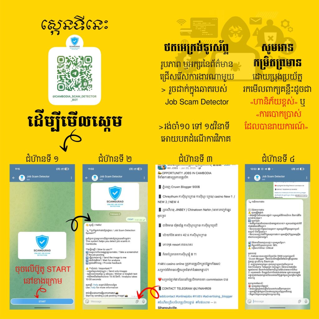 ចំណែកឯ Job Scam Detector អ្នកប្រើប្រាស់ចូលទៅកាន់កម្មវិធីតេឡេក្រាម រួចស្វែងរក ឈ្មោះ Job Scam Detector ឬ ចុចលើតំណភ្ជាប់ t.me/cambodia_scam_detector_bot។ អ្នកប្រើប្រាស់ត្រូវថតស្គីនសារដែលសង្ស័យ ដែលទទួលបានពីតេឡេក្រាម រួចផ្ញើចូលទៅ Telegram bot នោះ។ កម្មវិធីនឹងធ្វើការវិភាគ ដើម្បីកំណត់ពីកម្រិតនៃហានិភ័យ ដោយផ្តោតលើ សូចនាករហានិភ័យមួយចំនួនដូចជា៖