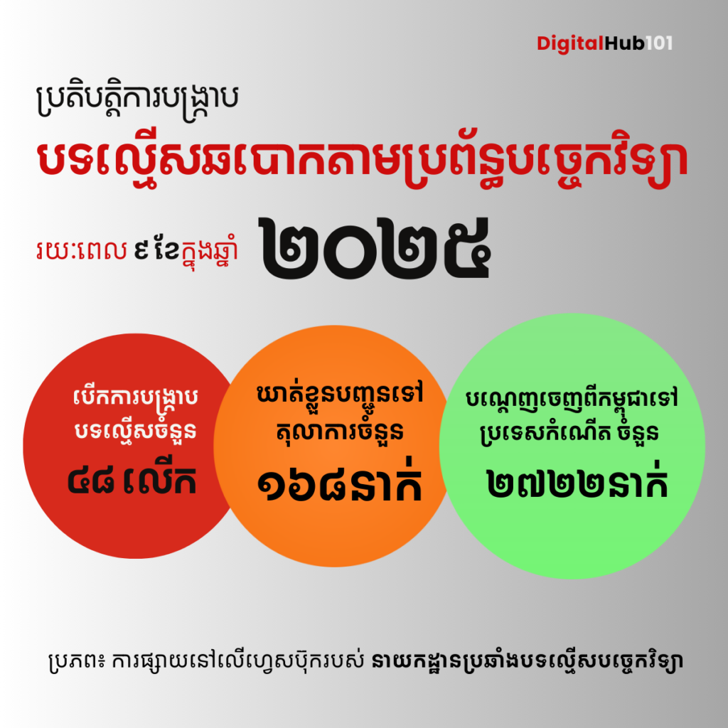 តាមរយៈទំព័រហ្វេសប៊ុករបស់នាយកដ្ឋានប្រឆាំងបទល្មើស បច្ចេកវិទ្យា (Anti Cyber Crime Department) ដែលបានចុះផ្សាយនៅថ្ងៃទី៣១ ខែមករា ឆ្នាំ២០២៦ បានរាយការណ៍ថា ក្នុងរយៈពេល៩ខែ ឆ្នាំ២០២៥ សមត្ថកិច្ចនគរបាលជាតិ បានបើកប្រតិបត្តិការបង្ក្រាបបទល្មើសឆបោកតាមប្រព័ន្ធបច្ចេកវិទ្យា បានចំនួន ៤៨លើក ឃាត់ខ្លួនបញ្ជូនទៅតុលាការចំនួន ១៦៨នាក់ និងបណ្ដេញចេញពីកម្ពុជាទៅប្រទេសកំណើត ចំនួន ២៧២២នាក់។