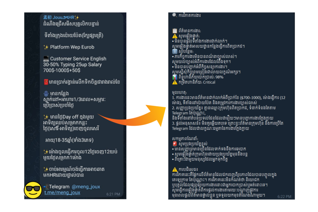 ស្រដៀងគ្នានេះដែរ កាលពីថ្ងៃទី៣ ខែកុម្ភៈឆ្នាំ២០២៦ មជ្ឈមណ្ឌលសម្ព័ន្ធភាពការងារ និងសិទ្ធិមនុស្ស (សង់ត្រាល់) ក៏បានប្រកាសដាក់ឱ្យប្រើប្រាស់កម្មវិធីដែលមានឈ្មោះថា Job Scam Detector ដែលជាប្រព័ន្ធជួយត្រួតពិនិត្យការងារក្លែងក្លាយនៅកម្ពុជា។ កម្មវិធីនេះប្រើបច្ចេកវិទ្យា AI ដំណើរការនៅលើកម្មវិធី តេឡេក្រាម (Telegram Bot)។ Job Scam Detector អាចជួយ ពិនិត្យសារ ពិនិត្យលេខទូរស័ព្ទ ពិនិត្យដំណរភ្ជាប់ដែលគួរឱ្យសង្ស័យ និងប្រាប់ថា តើព័ត៌មាននោះទំនងជាការផ្សព្វផ្សាយការងារឆបោកឬអត់។